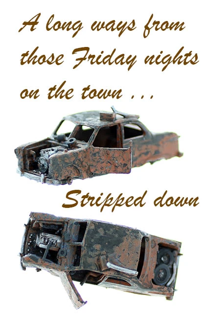 Use in a scrapyard, abandoned beside a building, abandoned in the woods or roadside rusting away.