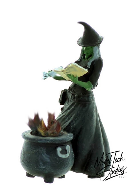 Really neat small scene maker with her holding a bone over her fiery cauldron. HO scale Figures by Model Tech Studios LLC