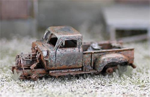 Detailed down to the jarred open door, tire and junk piping in the bed, rusted out – junked old pickup truck