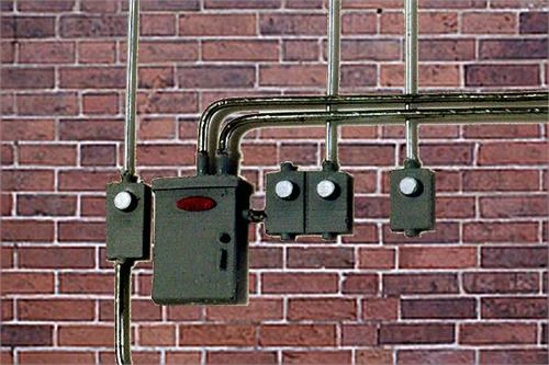 Detailing includes, Single, Double and Triple Power Meters, Junction Box and Power Heads plus Conduit. 12 Piece Set in S Scale