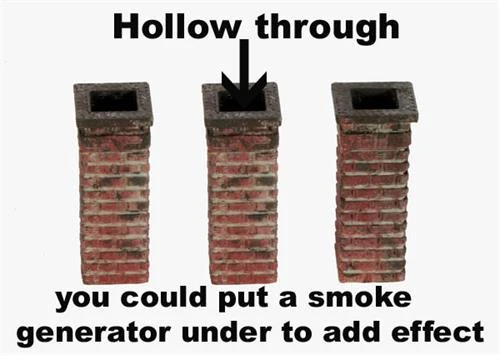 3 chimney’s in S Scale come FINISHED and ready for your rooftops. They are hollow through too so you could even put a small smoke generator under them to have smoke coming out for effect.